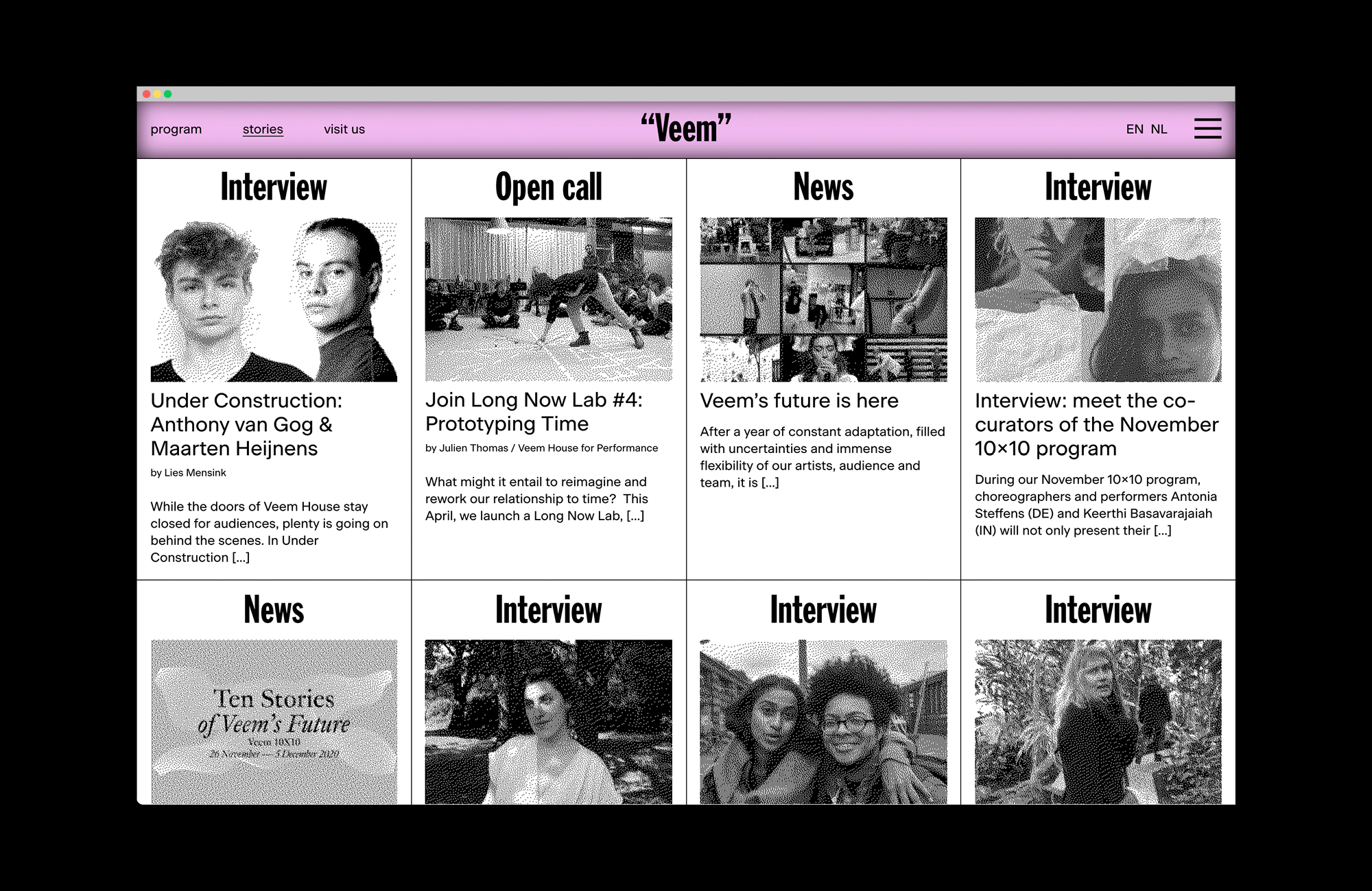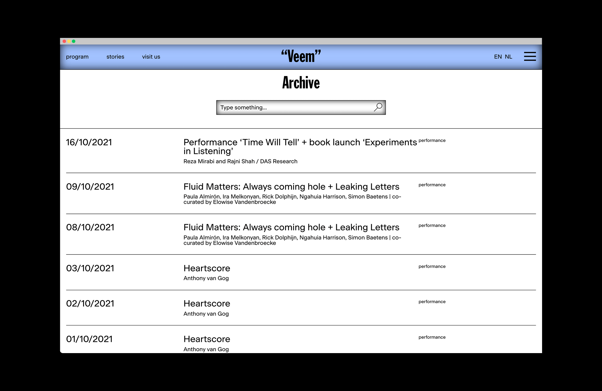 Veem House for Performance is a theatre and production house in Amsterdam, oriented to international audiences and artists who are given the space to experiment, develop and present their work. Next to the performances by up and coming artists, Veem's program includes their own discursive 'house' events.